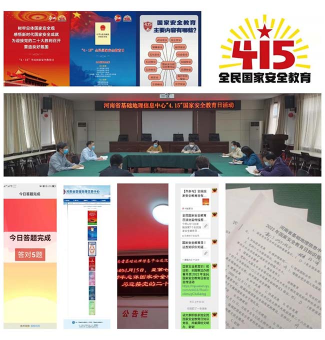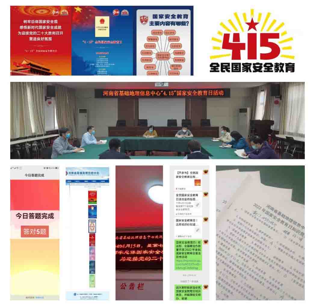 2022年4月15日是第七个全民国家安全教育日,今年的活动主题是“树牢总体国家安全观,感悟新时代国家安全成就,为迎接党的二十大胜利召开营造良好氛围”。河南省基础地理信息中心积极开展了“国家安全教育日”系类活动。