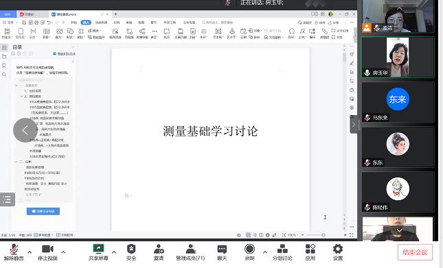 根据测绘岗位特点,会议对测绘的基础知识,如坐标系的定义、投影等进行了讲解;房玉华结合自已的工作经验,对基础知识进行了串讲和补充。与会人员针对有关技术问题线上进行了咨询和讨论。
