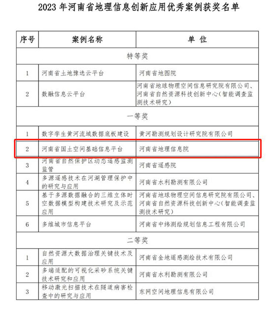 在近日揭晓的2023年河南省地理信息创新应用优秀案例评选中,河南省地理信息院凭借其坚实的技术实力与创新成果,一举斩获两项重要奖项,为河南省地理信息事业的发展再添辉煌篇章。其中,“河南省国土空间基础信息平台”项目荣获一等奖,而“多源遥感在城市地理信息数据更新中的应用”案例则荣获二等奖,充分展现了我院在地理信息领域的技术引领力和创新实践能力。