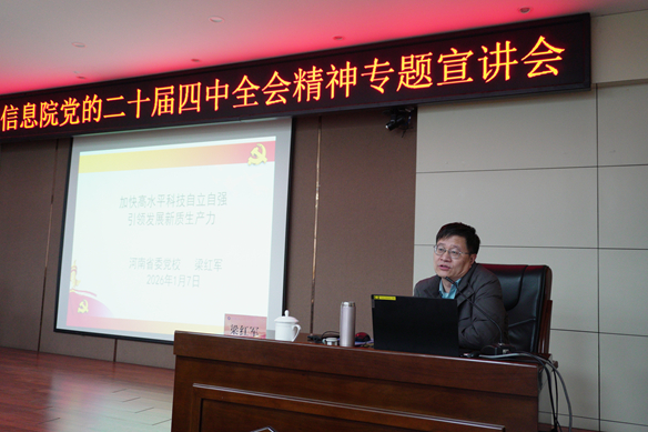 梁红军教授以“加快高水平科技自立自强,引领发展新质生产力”为主题,从科学技术与人类现代化、中国式现代化要靠科技现代化作支撑、引领发展新质生产力的着力点等三个方面,系统阐释了全球科技革命演进规律与我国发展战略需求、科技现代化对中国式现代化的支撑作用及实践路径,并就党的二十届四中全会对发展新质生产力作出的战略部署进行了深入解读。宣讲内容紧扣实际,论述清晰,有效深化了与会人员对全会精神的理解。