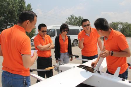 在水库的大坝上,房玉华副主任拿出准备好的地图和影像图与曲刚处长、省防汛办的负责人,以及水库的领导商议灾情报告,确定了影像获取方案。演习组决定由中心和遥感院两个队伍分别进行无人机飞行。中心无人机组采用的是垂直起降固定翼无人机,12点45左右起飞,在航高1297米,飞行大约45分钟左右,布设了6条航带,拍摄航片218张,控制面积约27平方公里,经过快速成图可生成分辨率0.15米的高清影像图。