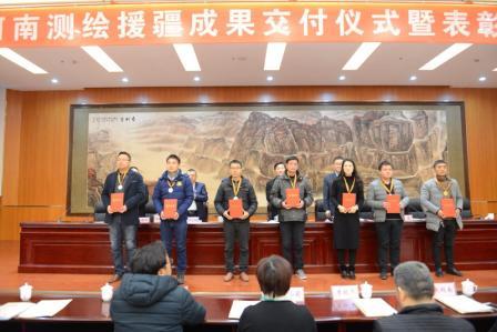 在2018年1月24日召开的河南测绘援疆成果交付仪式暨表彰大会上,河南省基础地理信息中心荣获了“河南省测绘援疆优秀单位”称号,中心援疆测绘队员曹莹、周帅锋、陈怡昊、刘亚龙荣获“河南省测绘援疆先进个人”称号。