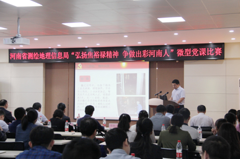 为深入学习贯彻习近平新时代中国特色社会主义思想和习近平总书记调研指导河南时的重要讲话,认真贯彻落实省委十届六次全会精神,大力弘扬焦裕禄的“三股劲”精神,以新担当展现新作为。9月29日上午,河南省测绘地理信息局举行“弘扬焦裕禄精神 争做出彩河南人”微型党课比赛,河南省基础地理信息中心选派三名选手参加此次比赛。河南省国土资源厅党组成员,省测绘地理信息局党委书记、局长刘济宝高度重视,亲临现场观看比赛。局党委委员、纪委书记何晨参加会议并讲话,局党委委员、副局长毛忠民到场观看比赛。局属各单位、局机关各处室干部职工代表100余人一起聆听了精彩的党课。