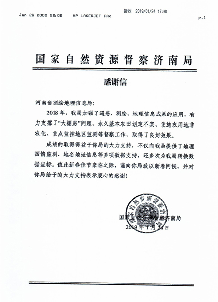 2019年1月28日,河南省基础地理信息中心(测绘资料档案馆)收到了省局转发的来自国家自然资源督查济南局的表扬信。信中写到:2018年,我局(国家自然资源督查济南局)加强了遥感、测绘、地理信息成果的应用,有力支撑了“大棚房”问题、永久基本农田划定不实、设施农用地非农化、重点监控地区监测等督查工作,取得了良好效果。成绩的取得得益于你局的大力支持,不仅向我局提供了地理国情监测、地名地址信息等多项数据支持,还多次为我局转换数据坐标。值此新春佳节来临之际,谨向你局致以新春问候,并对你局给予的大力支持表示中心的感谢!